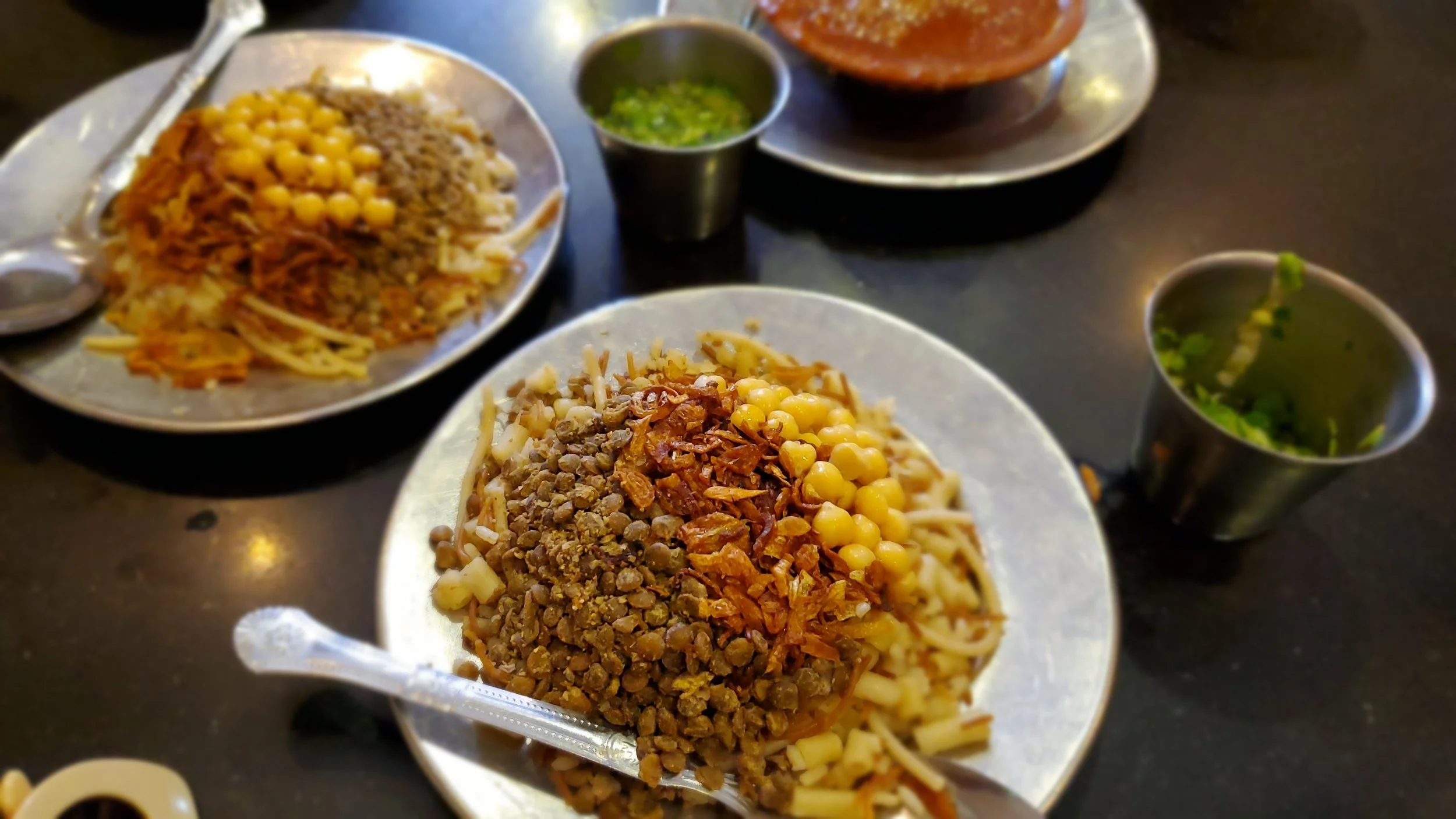 Eat koshari, ful (mashed fava beans with pita bread), ta’ameya (falafel made of fava beans), molokhia (okra stew), and hamam mahshi (grilled pigeon).