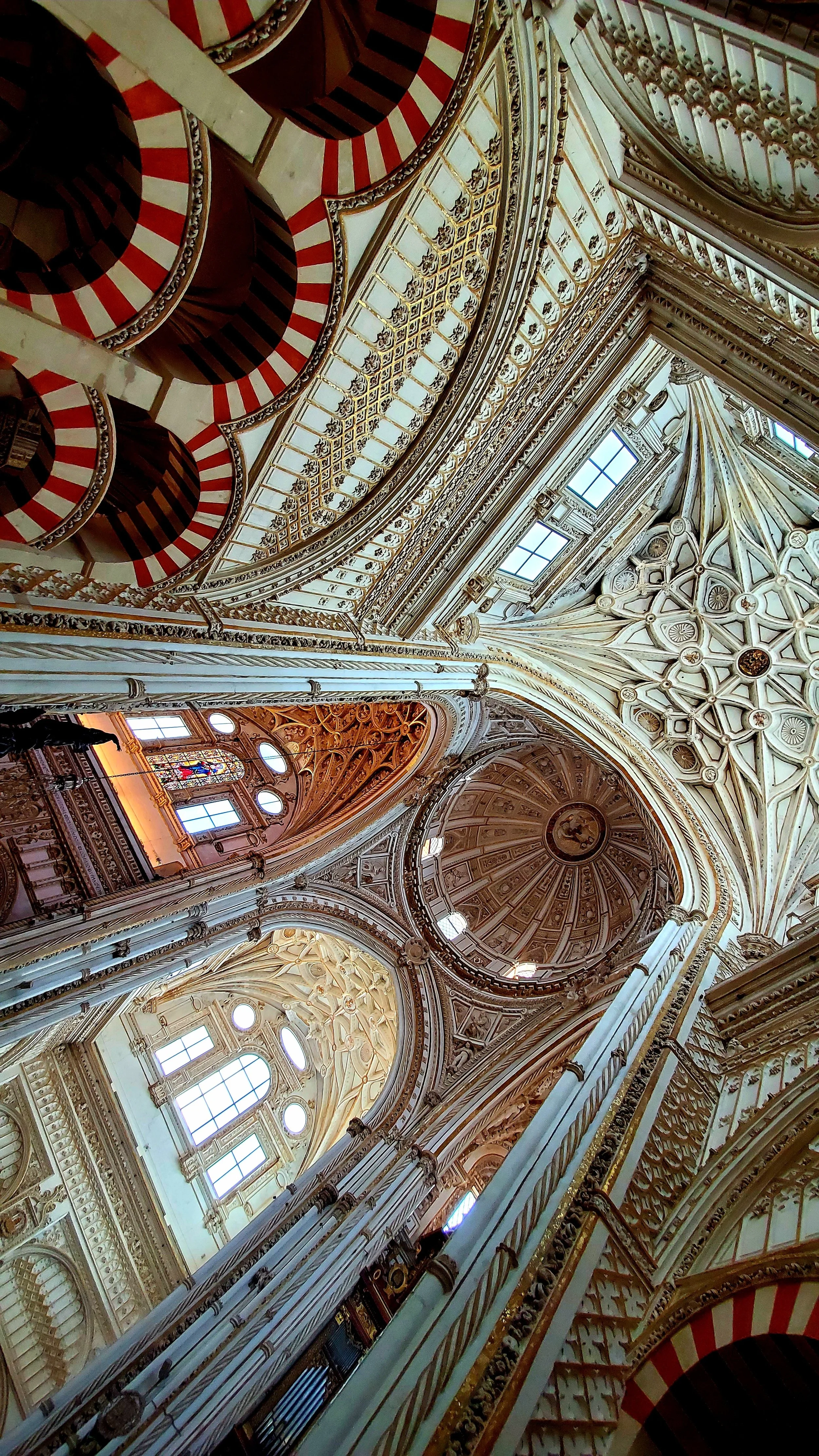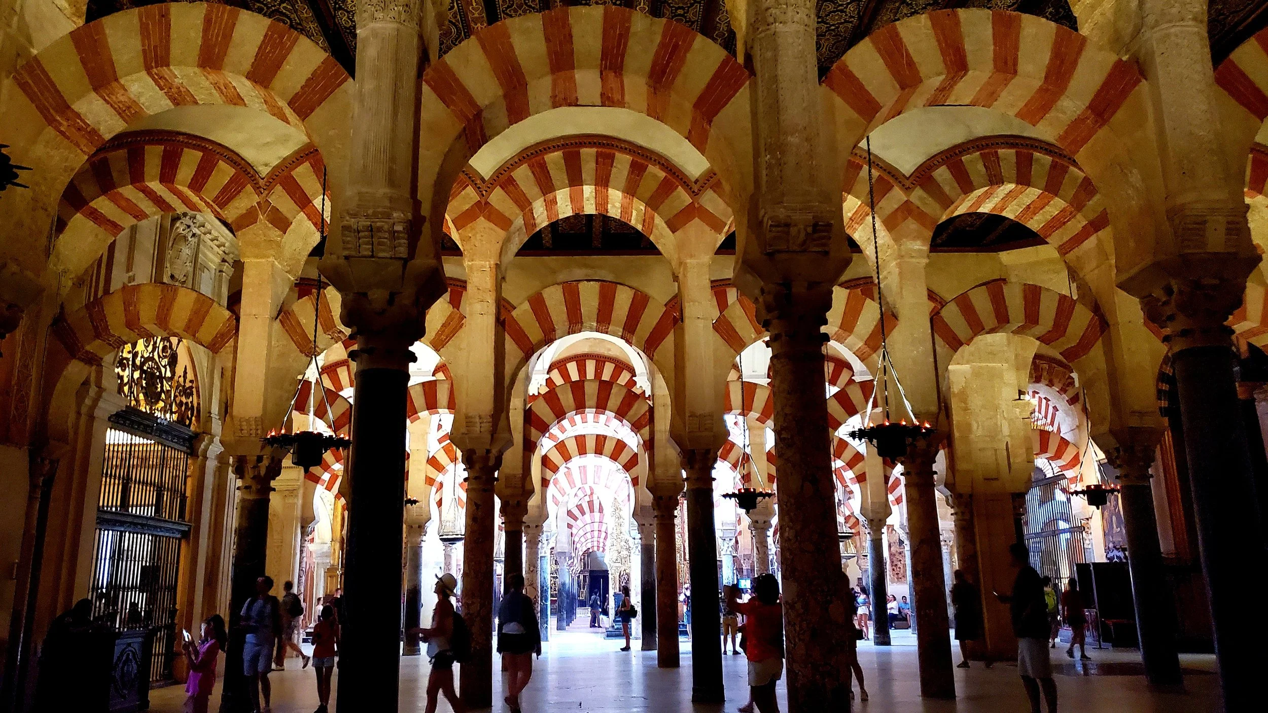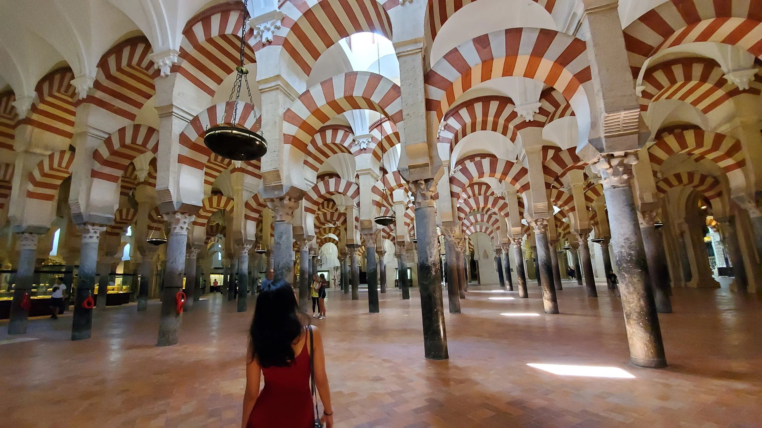 It contains over 800 arches which, despite appearances, aren't painted red and white but are actually alternating red brick and white stone. The columns are topped with double arches—a round Romanesque arch above a Visigothic horseshoe arch. These arches were recycled from ancient Roman ruins and conquered Visigothic churches. They seem to recede into infinity.